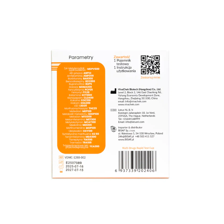 Zaawansowany test narkotykowy w formie pojemnika do badania próbek moczu. Umożliwia jednoczesne wykrycie aż 28 substancji psychoaktywnych, co czyni go wyjątkowo kompleksowym narzędziem diagnostycznym. Dzięki innowacyjnej formie kubka testowego cała procedura jest higieniczna, wygodna i prosta – wystarczy oddać próbkę moczu bez konieczności dodatkowych akcesoriów.