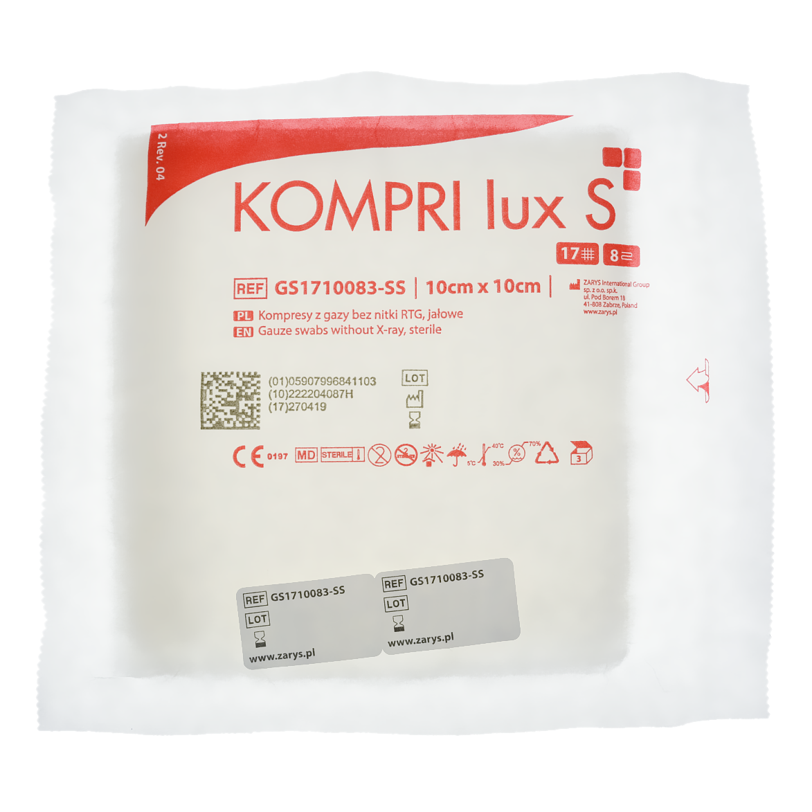 Kompresy wykonane z wysokiej jakości gazy bawełnianej, bielone metodą bezchlorową. Podwójnie podwijane brzegi tzw. składanie typu „es” - zapobiega wysnuwaniu się luźnych nitek, co zwiększa bezpieczeństwo użytkowania. Stosowane jako materiał opatrunkowy do opatrywania różnego rodzaju ran. Pakowane w blistry. Produkt jednorazowego użytku, jałowy.