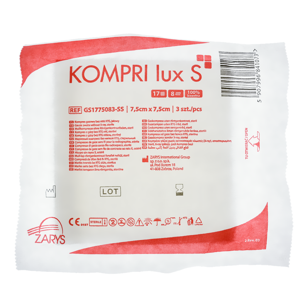Kompresy wykonane z wysokiej jakości gazy bawełnianej, bielone metodą bezchlorową. Podwójnie podwijane brzegi tzw. składanie typu „es” - zapobiega wysnuwaniu się luźnych nitek, co zwiększa bezpieczeństwo użytkowania. Stosowane jako materiał opatrunkowy do opatrywania różnego rodzaju ran. Pakowane w blistry. Produkt jednorazowego użytku, jałowy.