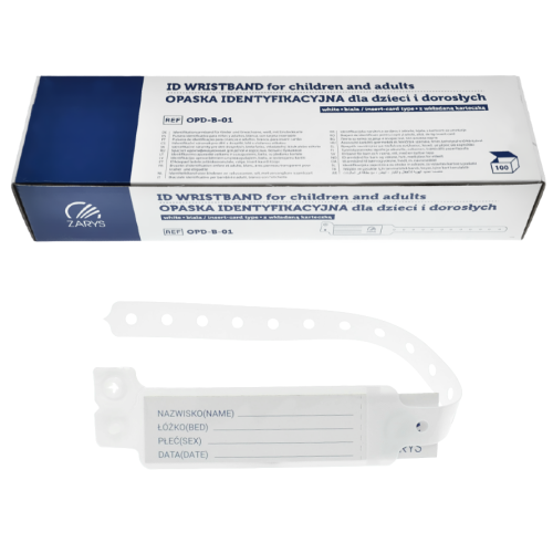 Opaski służą do identyfikacji pacjentów na oddziałach szpitalnych. Wykonane są z miękkiego winylu, zaokrąglone brzegi i delikatny materiał nie powodują dyskomfortu dla pacjenta. Szeroki zakres regulacji zapewnia dobre dopasowanie do nadgarstka.