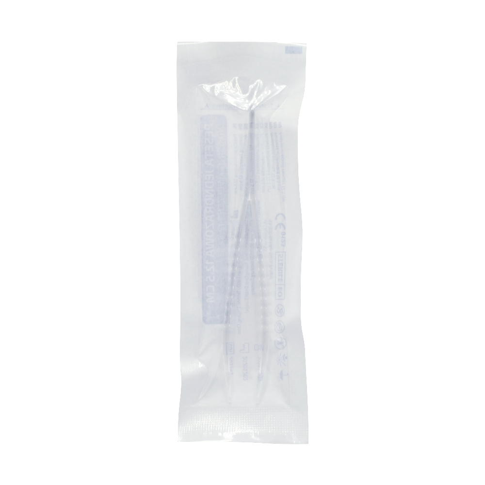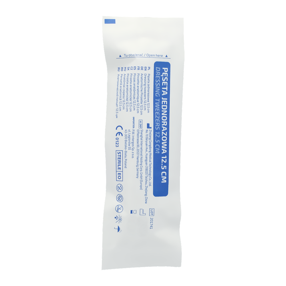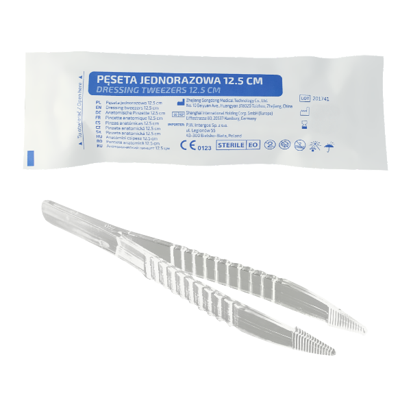 Pęseta plastikowa, jałowa. Przeznaczona między innymi do trzymania materiałów opatrunkowych podczas zabiegów ambulatoryjnych. Pinceta ma anatomiczny kształt i ząbki w części pracującej dla lepszego chwytu.