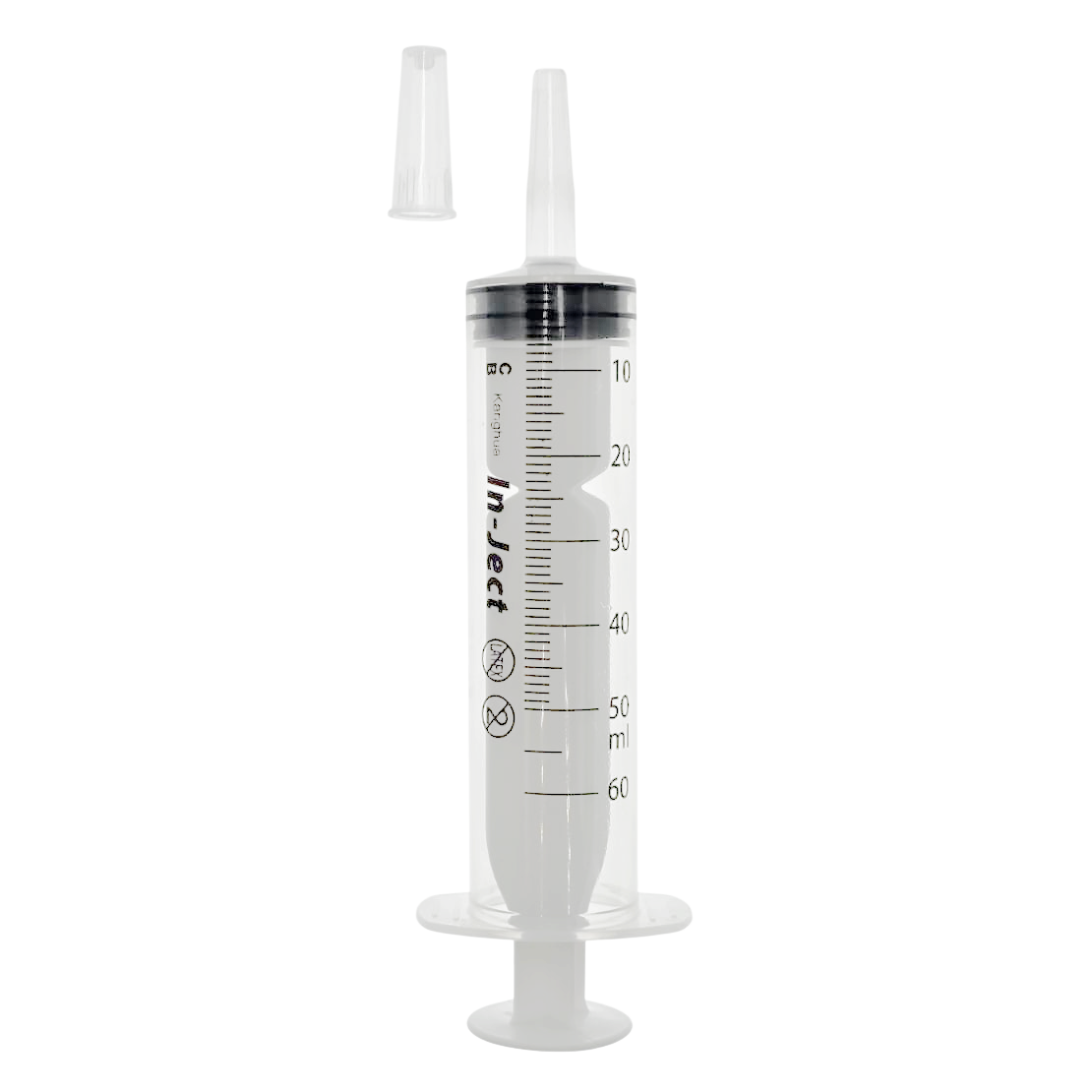 Strzykawka trzyczęściowa o pojemności 50-60 ml. Posiada końcówkę do cewników. Do strzykawki dołączona jest zatyczka.