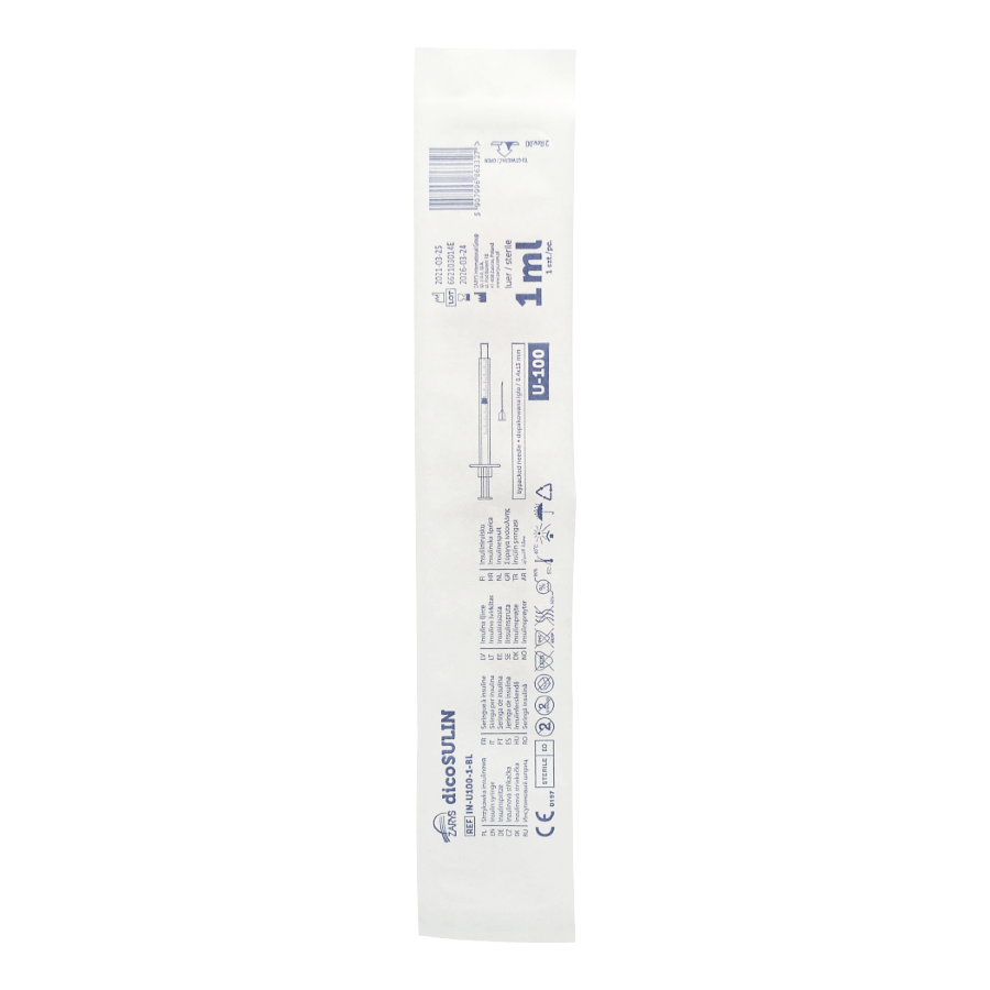 Strzykawka insulinowa sterylna z igłą zdejmowaną. Gumowe pierścienie gwarantują całkowite podanie środka. Przezroczysty cylinder pozwala na obserwowanie zawartości strzykawki. Wyraźne i czytelne znaczniki skali ułatwiają dokładne dawkowanie leku.