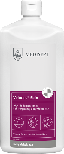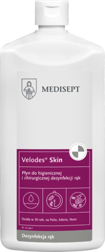 Velodes® Skin to płynny, alkoholowy, gotowy do użycia produkt do higienicznej i chirurgicznej dezynfekcji rąk o działaniu bakteriobójczym, prątkobójczym, grzybobójczym, wirusobójczym (w tym: HBV, HIV, HCV oraz Adeno, Polio, Noro).