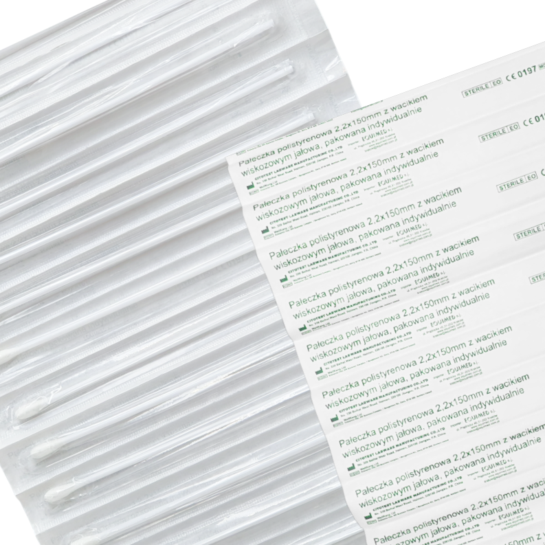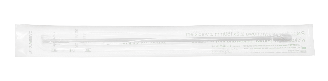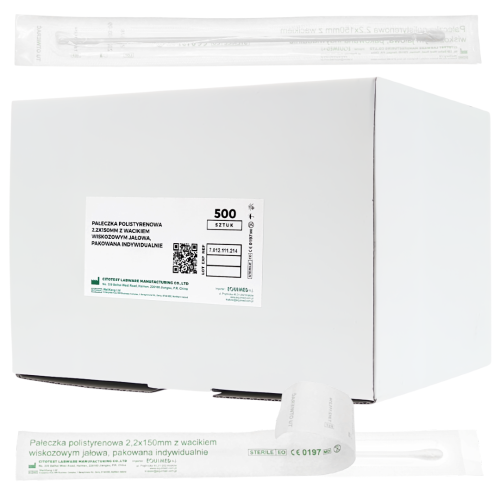 Sterylna wymazówka o długości 15 cm z polistyrenowym trzonkiem i wacikiem wiskozowym. Przeznaczona do precyzyjnego pobierania próbek w medycynie, diagnostyce i badaniach laboratoryjnych. Opakowanie zawiera 500 sztuk jałowych blistrów.