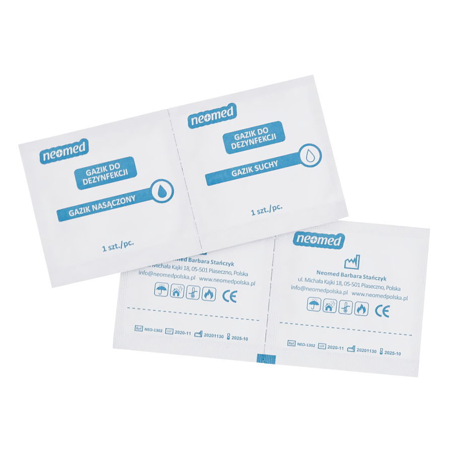 Zestaw zawiera gaziki mokre oraz suche. Gaziki włókninowe mokre nasączone są 70% alkoholem izopropylowym. Sprawdzą się do dezynfekcji niewielkich powierzchni, dezynfekcji skóry przed iniekcjami - szczepieniami czy pobieraniem krwi, w pielęgnacji pępka u niemowląt, na drobne skaleczenia oraz podczas innych zabiegów kosmetycznych i medycznych.